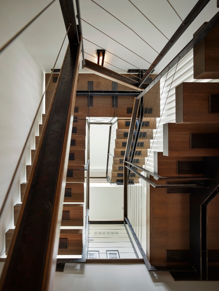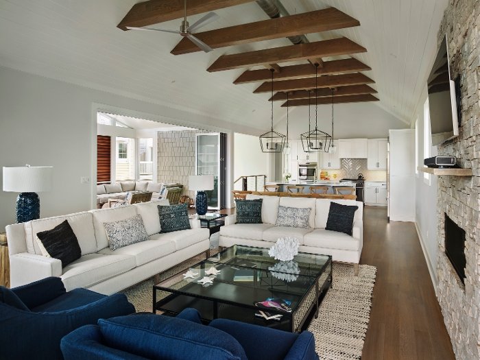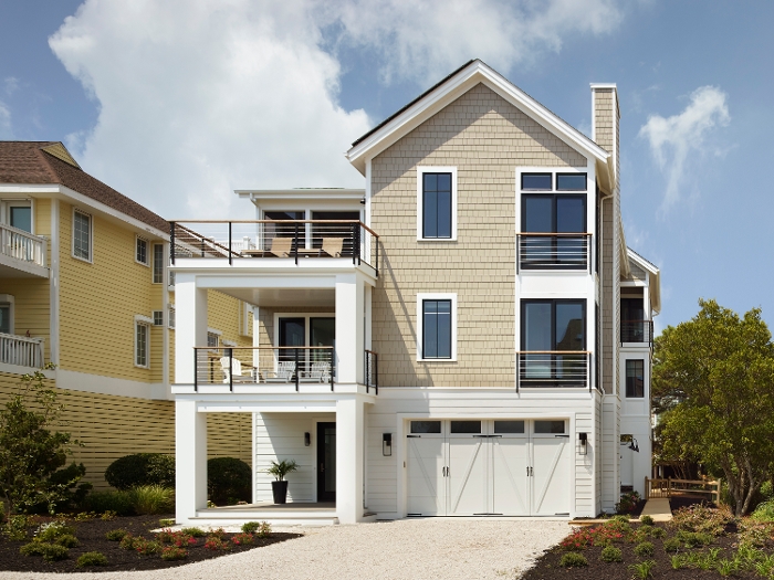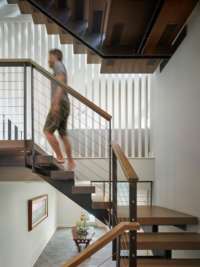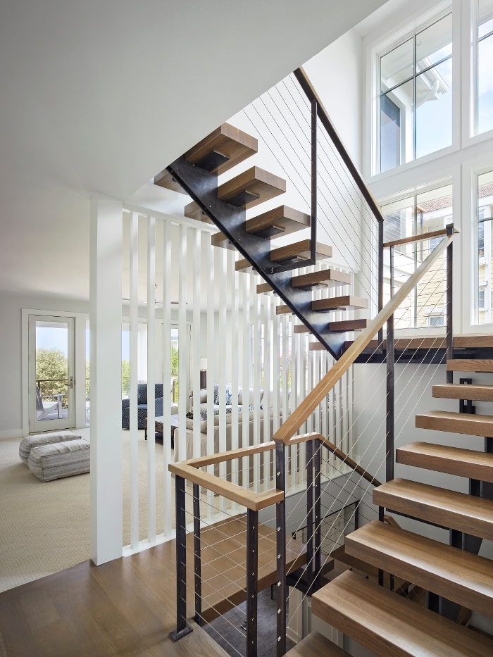 Another SeaStudio Architects design, this home features a modern Beachy exterior, with some stunning industrial touches throughout the interior. Some key features of this home include the floating white oak staircase that runs from the ground floor up to the main living area, vaulted ceilings accompanied with nickel-gap trim work and exposed white oak beams, and custom Ipe privacy louvre panels in the porch with a Nano-wall slider to expand indoor/outdoor living space during the warmer months.